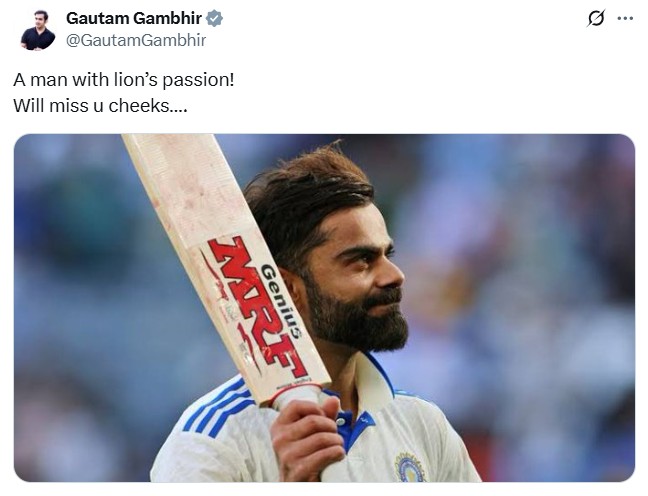 टीम इंडिया के हेड कोच गौतम गंभीर ने लिखा, "शेर जैसा जुनून वाला आदमी! चीकू तुम्हें मिस करेंगे।"