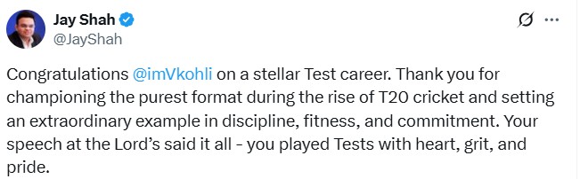 ICC चेयरमैन जय शाह ने कोहली के संन्यास पर कहा, "शानदार टेस्ट करियर के लिये बधाई विराट कोहली। टी20 क्रिकेट के उत्थान के दौर में पारंपरिक प्रारूप की लोकप्रियता बनाये रखने और अनुशासन, फिटनेस, प्रतिबद्धता के मामले में असाधारण उदाहरण प्रस्तुत करने के लिये धन्यवाद।"