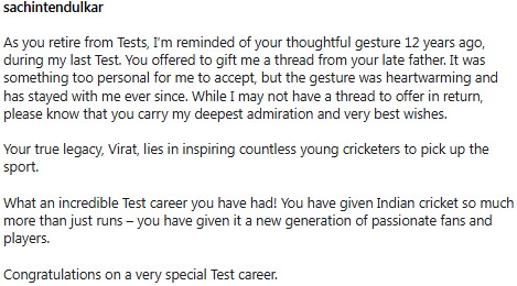 क्रिकेट के भगवान कहे जाने वाले सचिन तेंदुलकर ने विराट के संन्यास पर एक भावुक पोस्ट साझा किया।उन्होंने लिखा, "टेस्ट से संन्यास लेने के बाद मुझे 12 साल पहले मेरे आखिरी टेस्ट के दौरान आपके द्वारा किए गए विचारपूर्ण हाव-भाव की याद आ रही है। आपने मुझे अपने दिवंगत पिता की ओर से एक खास उपहार में देने की पेशकश की थी। यह मेरे लिए स्वीकार करने के लिए बहुत ही व्यक्तिगत बात थी लेकिन यह भाव दिल को छू लेने वाला था और तब से मेरे साथ है। भले ही मेरे पास बदले में देने के लिए कोई धागा न हो लेकिन कृपया जान लें कि मेरी गहरी प्रशंसा और शुभकामनाएं आपके साथ हैं।"
