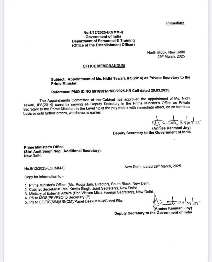 29 मार्च 2025 को जारी एक आधिकारिक ज्ञापन के अनुसार, कैबिनेट की नियुक्ति समिति ने निधि तिवारी की नियुक्ति को मंजूरी दी। यह नियुक्ति तत्काल प्रभाव से लागू हो गई है।