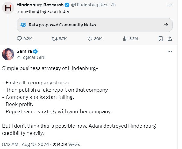 हिंडनबर्ग रिसर्च के पोस्ट को लेकर सोशल मीडिया पर लोगों ने अपनी प्रतिक्रिया दी है। समीरा नाम की यूजर ने लिखा, ‘हिंडनबर्ग की यह सिंपल स्ट्रेटजी है। जहां वो कंपनी के शेयर की शॉर्ट सेलिंग कर पैसे कमाते हैं, लेकिन इस बार ऐसा करने में वो सफल नहीं होंगे। अडानी समूह ने हिंडनबर्ग की प्रतिष्ठा को काफी नुकसान पहुंचाया है।’