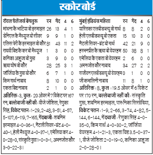 बेंगलुरू। कप्तान हरमनप्रीत कौर (50), नेट सायबर ब्रंट (42) और अमनजोत कौर (3 विकेट/नाबाद 34) हरफनमौला प्रदर्शन की बदौलत मुम्बई इंडियंस ने शुक्रवार को वूमेंस प्रीमियर लीग के सातवें मुकाबले में रॉयल चैजेंजर्स बेंगलुरु को चार विकेट से हरा दिया। 167 रनों के लक्ष्य का पीछा करने उतरी मुंबई इंडियंस की शुरूआत अच्छी नहीं रही और उसने दूसरे ही ओवर में यास्तिका भाटिया (आठ) का विकेट गवां दिया। उन्हें किम गार्थ ने आउट किया।