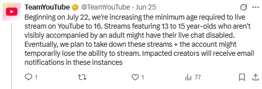 YouTube की टीम ने X पर एक पोस्ट कर बताया कि यह नई नीति 22 जुलाई से लागू होगी। अगर किसी लाइव स्ट्रीम में 13 से 15 साल का टीनएजर अकेला नजर आता है, तो उस स्ट्रीम का चैट फीचर तुरंत बंद कर दिया जाएगा। जरूरत पड़ने पर चैनल को अस्थाई रूप से सस्पेंड किया जा सकता है।
